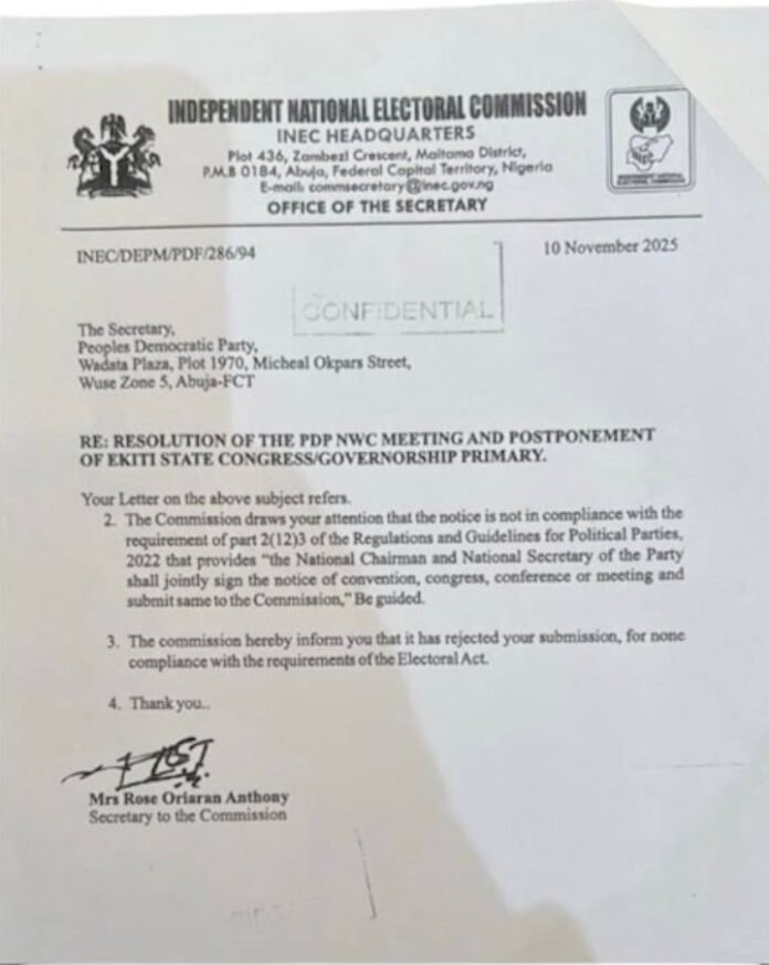 The Independent National Electoral Commission (INEC) has “disowned a circulating correspondence alleging that the commission approved resolutions of a purported PDP National Working Committee (NWC) meeting which postponed the party’s Ekiti State Congress and governorship primary.”