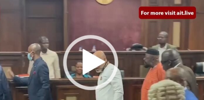The video captures the moment there was an outburst from the detained leader of the Indigenous People of Biafra (IPOB), Nnamdi Kanu in the courtroom after Justice James Omotosho of the Federal High Court in Abuja on Thursday “ordered security agents to bundle him out of the courtroom,” after he “insisted that judgement would not be delivered in the terrorism charge the Federal Government entered against him.”